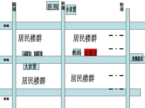 位置在比较繁华的主干道上 我们这里叫鬼街 就是这里卖丧葬用品的多 其主干道上有一个农贸有200米远 (但这个农贸对面有两家200平米超市 生意都很好,我想感觉离农贸近的地方开超市 在200平左右的几乎都很好 我们这里) 和主干道垂直的一个小道上 还有一个农贸 比这个小点 是自发形成的 这个店挨着一家大众洗浴 和这个店不远有一家连锁超市 但个人感觉不太影响这里 这里是12年左右的7层楼房 人口密度很大 但几乎每个楼房都有个小超市(都是民房改的 面积在50平左右)