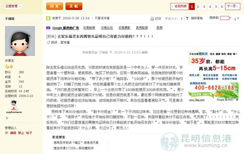 5月30日在昆明信息港彩龙论坛(club.clzg.cn)上,网友“不倒翁”发表的一篇名为《去家乐福买东西需要先证明自己有能力付钱吗?》()的帖子引起了网友的激烈讨论。帖子中,“不倒翁”讲述了自己在昆明家乐福云纺店目睹收银员“审问”一个中年女顾客“是否带够钱”的一幕,并指出该收银员还以“怕她钱不够付”为由把顾客要买的货品扣下。帖子发表不到一天时间便收到了网友的大量关注和回帖,更有网友为该事件起名家乐福“白眼门”,认为这是对昆明家乐福企业形象的一次挑战。