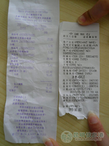 记者通过网络与发帖人“不倒翁”取得了联系,她向记者出示了当日购物单据的照片,也进一步讲述了事件的经过。她表示事件中遭遇盘问的“中年女顾客”是其在排队付款时排在她前面的一位阿姨,她对这位阿姨的描述是:“穿一件花布衬衣,手里拿着一个塑料袋,装钱用的。”当家乐福收银员见到这位阿姨后便对其进行了“审问”——