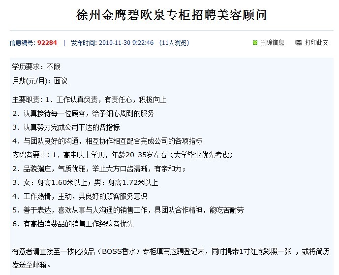 碧欧泉在当地的招聘广告,正式的招聘广告应该会在金鹰的DM上出现。