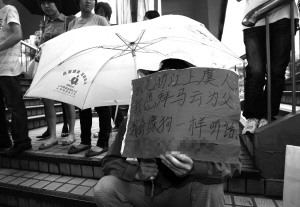 当旁边的人开始拿出手机拍他的时候,他呼一下把牌子举高,完全挡住脸。为了躲别人的镜头,他一直用牌子遮挡自己的脸。