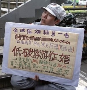 7分钟后,闻先生来电:杭州百货大楼C馆门口这边,看到一个外地男子,大概30岁不到,在征婚。他自称是“全球征婚榜第一名”,说这次来杭州是进行低碳旅游征婚。要找一个年薪100万, 能够付出80万来进行低碳环保活动的财智美女,想找这么一个女的结婚。