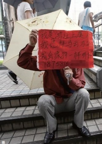 赶到后,先看到一个戴草帽,撑太阳伞的小伙子在广场上走来走去,胸前抱着一块牌子,红底黑字写着:我是浙江上虞人,我愿拜马云为父,我会像狗一样听话。187××××××××。