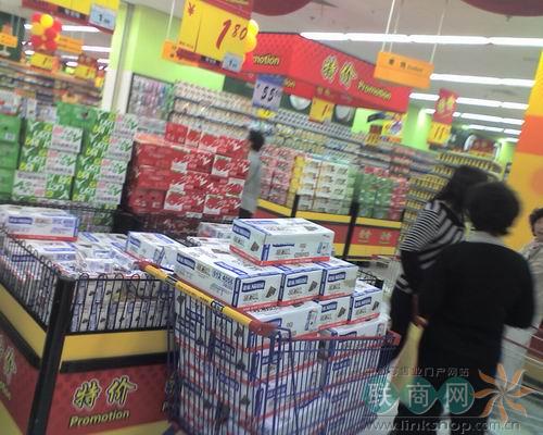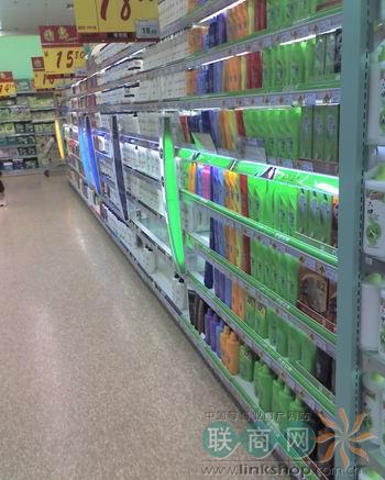 超市的一楼下地下一层的转角处是化妆品形象专柜,面积不是很大,其它洗化用品都在地下食品区的一个死角,设计师想通过洗化区功能性产品的特性,引导顾客走完整个超市。在易买得超市的洗化区我没有看到已往超市陈列洗发护肤的矮货架,全部是2.2米左右的高货架,在货架上加了灯光照明,感觉不是很宽敞,过道有压抑的感觉.