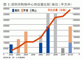 消费需求的强劲增长,使得大批机构和资金扎堆商业地产,开发购物中心打造各式“商圈”。在这股潮流下,购物中心在中国一线城市的发展渐趋饱和。以深圳为例,从2002-2008年,购物中心的供应面积逐渐攀升(图1),2009年有所放缓;在扩展方向上,新增供给也从核心老城区罗湖、福田向南山这样的新兴商区扩展。其他一线城市也面临同样的境况,开发商在商业地产上的圈地步伐逐渐放缓,开始大力向二线城市拓展。