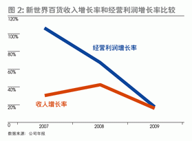 严峻的经营形势令一些百货商开始通过差异化战略塑造商场个性。新世界百货(00825.HK)位于沈阳的3家分店位置相近,太原街店与中华路店60%品牌重叠,与邻近的百盛商场也有30%重叠,出现互相抢生意的情况。尽管新世界百货的收入和利润持续增长,但是增长速度却显著下挫(图1)。在此情况之下,新世界百货2009年启动了对旗下所有百货店的“错位经营”策略。由于其不少分店是上世纪90年代收购或者自建的,早已过时,而且一些门店面积偏小,不适合现时顾客偏爱一站式购物的趋势。