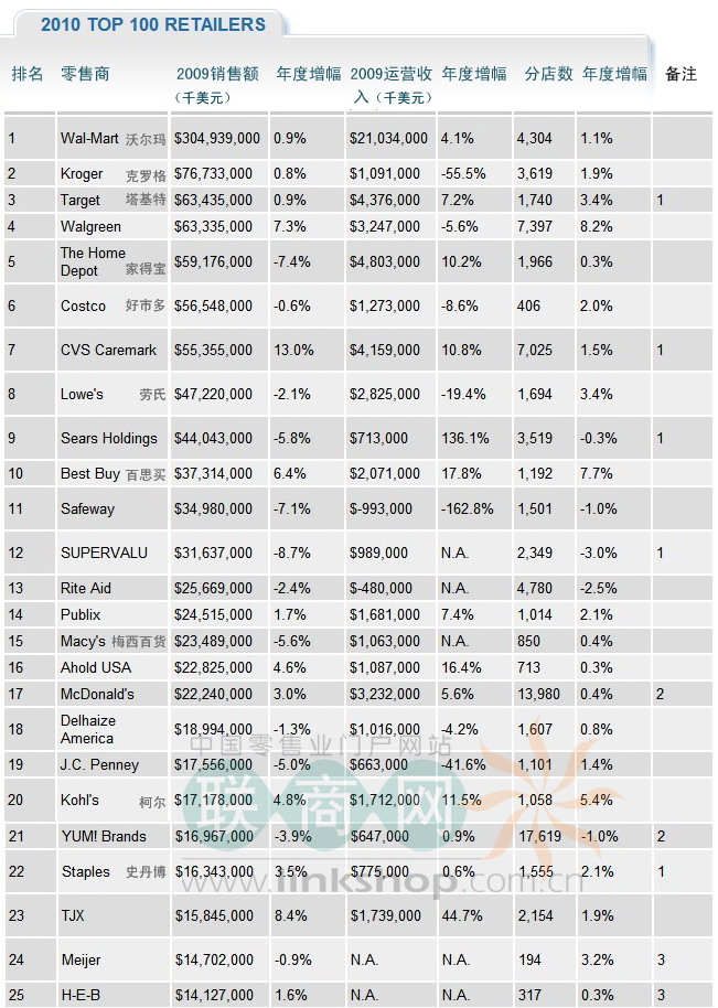 2010★美国强势零售商100强排行榜 美国专业零售杂志《STORES》在7月初的期刊中发布了最新的美国TOP100强势零售商榜单。 在引言中杂志编辑David P. Schulz 叙述道,美国零售商经历了一段动荡时期,但现在我们看到失业率以及消费者谨慎的支出态度都有所好转。 该榜单综合了美国服饰店、药店、百货店、超市、家居修缮、餐厅、消费电子类产品专卖店等业态的零售商。