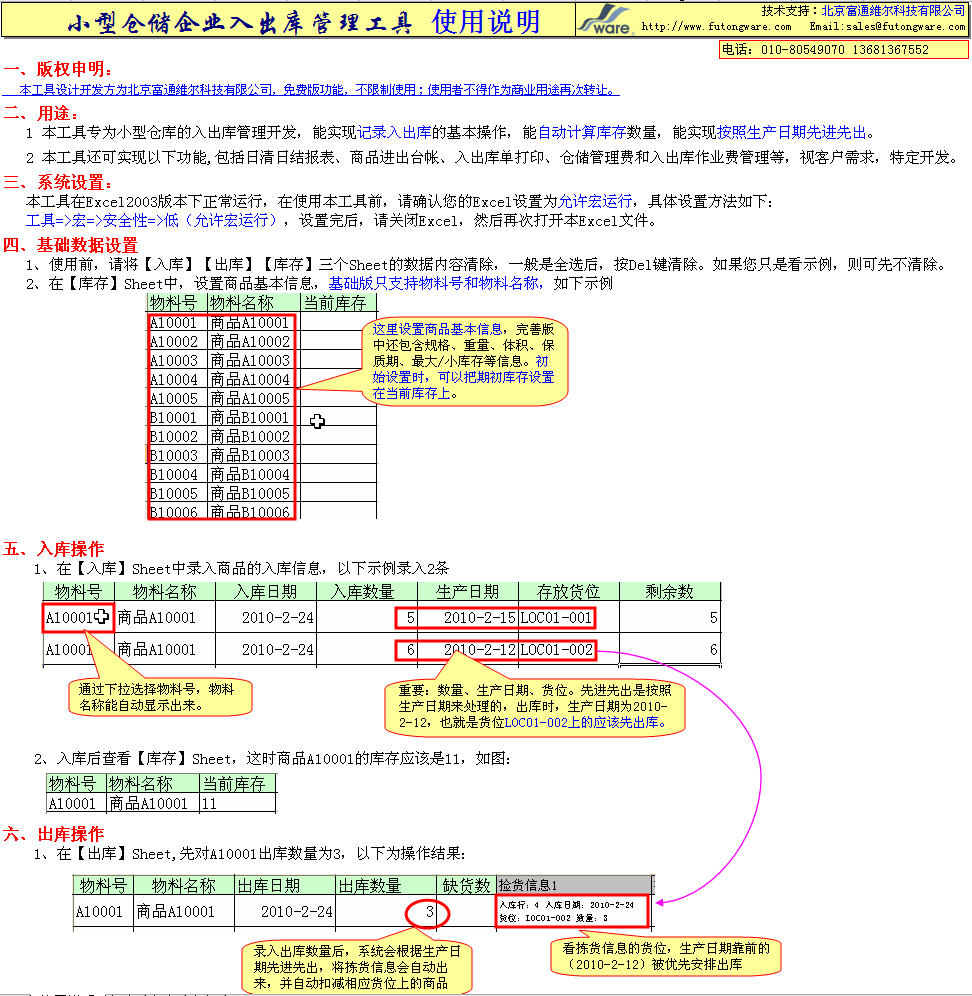 该工具采用Excel数据库引擎技术,按照软件工程思路设计开发,运行稳定,简单实用。公开版除了商品属性内容少,在功能上不做任何限制。可以随意使用, 但不得作为商业用途转让或出售。引用或者再次发布时,请注明来源:北京富通维尔科技有限公司公开版包含以下内容:1、入库管理,包含入库的物料代码、名称、数量、生产日期、入库日期、货位 a、在录入入库数量后,系统会自动更新库存模块的库存数量 b、支持修改功能,如果入库数量录错,可以修改,修改后会自动更新库存。 c、先进先出功能通过入库日期和货位共同来管理 d、拣货信息栏目用于显示该入库记录被何时出库2、出库管理,包含出库的物料代码、名称、数量、出库日期等信息 a、录入出库数量后,系统会直接按照生产日期先进先出原则,查找适合货位上的商品 b、找到相应货位后,从该货位减去出库数,同时减库存表数量;如果数量不够,则再继续找其他货位。 c、标记拣货信息(从哪个货位、拣出多少数量) d、如果最终的库存数不够出货,则再出库表对应记录上显示缺货数 e、公开版不支持修改出库数量功能3、以下功能是正式版功能,按照具体需求提供 a、入出库台账 b、日清报表 c、单项查询(查询指定商品的入出库信息) d、入出库库指令单查询/打印 e、费用管理:入出库费、保管费、场地费等费用的自动计算 f、商品基础信息扩展:规格、重量、体积、保质期、安全库存 g、保质期报警、补货报警/自动补货功能
