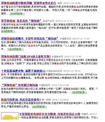 不明真相的朋友,可以看看现在的新闻,随变一搜“鱼油”就会出来这么多骇人听闻的消息。“深海鱼油”危害超过地沟油、鱼油EPA导致儿童性早熟。