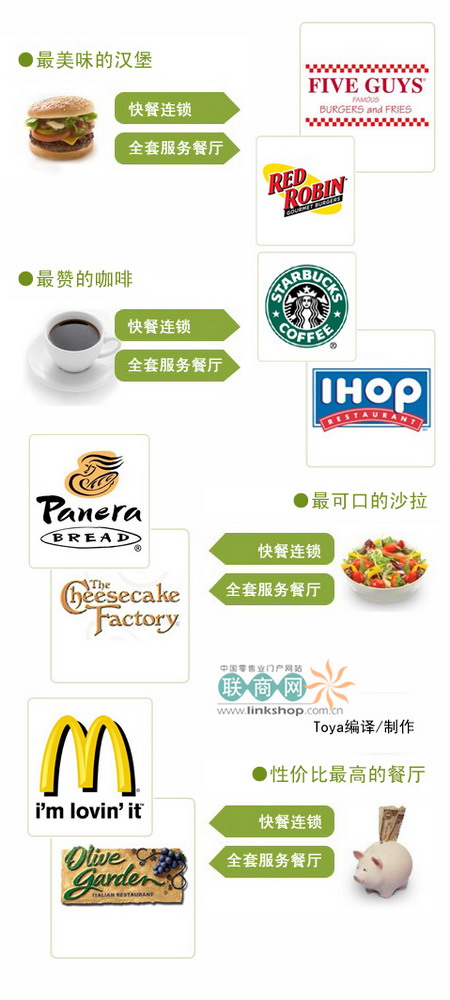 Zagat经过对6518名快餐店常客的调查评选得出 ★最美味的汉堡 1)Five Guys (奥巴马总统常光顾的快餐店) 2)In-N-Out Burger 3)Wendy's 4)Burger King 汉堡王 5)McDonald's 麦当劳 ★最棒的薯条 1) McDonald's 麦当劳 2) Five Guys 3) In-N-Out Burger 4) Wendy's 5) Burger King 汉堡王 ★最爽口的奶昔 1) Dairy Queen 冰雪皇后 简称DQ 2) Cold Stone Creamery 3) Sonic Drive-in 4) Chick-fil-A 5) Ben & Jerry’s 在所有快餐店中: 最佳炸鸡单品获奖餐厅: Kentucky Fried Chicken (KFC肯德基) 最佳烤鸡肉单品获奖餐厅:: Chick-fil-A 最佳鱼肉单品获奖餐厅:: Long John Silver's 最佳沙拉获奖餐厅: Panera Bread 最具儿童亲善餐厅: McDonald's 麦当劳 性价比最高餐厅: McDonald's 麦当劳 ■点击查看完整内容■(需企业会员资格) 小T.编译,转载务必注明来源联商网