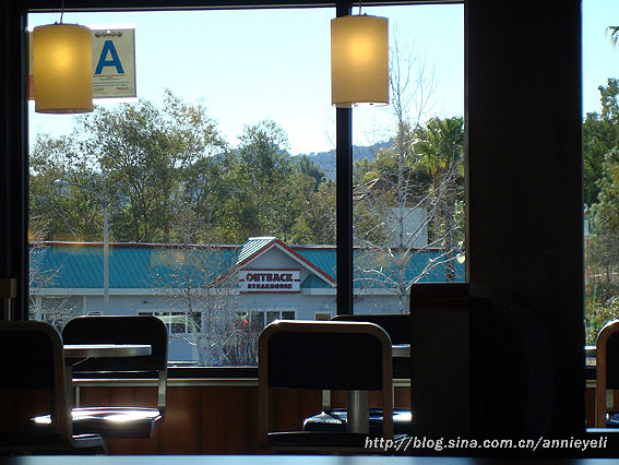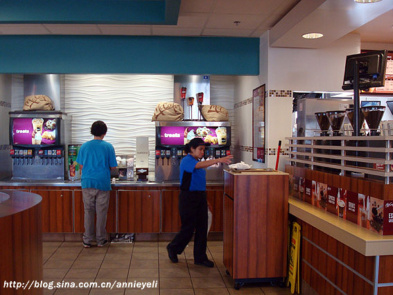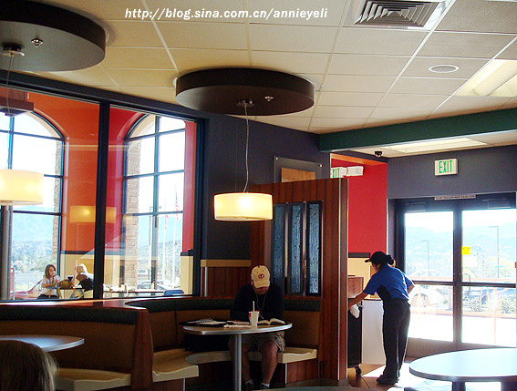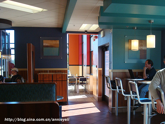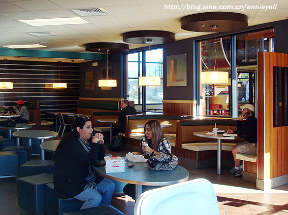 我们一行3人到洛杉矶“新一代”装修的麦当劳店吃早餐顺便用洗手间。该连锁餐馆的卫生指标达A(第1张),用餐环境令人耳目一新,时尚、宽敞,各式各款的座椅按不同功能分区域摆设。为了跟星巴克竞争客源,店里还提供大型儿童游乐场和无线信号供食客上网,吸引大小客人并留住他们的脚步。