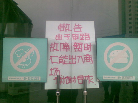 断电、撤货、员工休假 挂在家乐福门上的“电路故障”敬告牌,让当地百姓哭笑不得。因为它所在的摩登市商业步行街上,奥斯卡影院、五星电器、肯德基餐厅等,灯火流光溢彩、人流穿梭不止。家家是促销热卖的欢歌,此起彼伏。