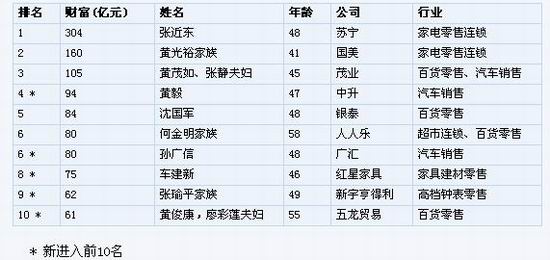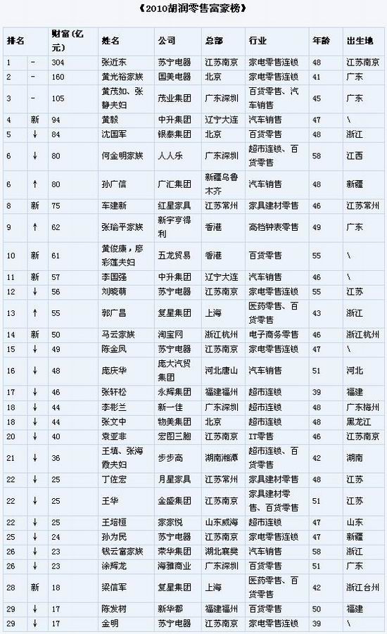 “零售大王”张近东以财富304亿元第三次荣登“胡润零售富豪榜”首富宝座;黄光裕家族以财富160亿元位居其次。 汽车销售成为新一个重点零售行业。百货零售有10人上榜,还是零售榜上比重最大的子行业。 今年共有5位新上榜者,其中中升的黄毅以财富94亿元成为“零售黑马”,同时也是“汽车零售大王”。 淘宝的马云首次登上“胡润零售富豪榜”。 10月25日下午消息,《2010胡润零售富豪榜》今日在上海发布,苏宁电器的张近东以财富304亿元的绝对优势稳坐首富宝座。国美的黄光裕在激烈的权利争夺战中保持第二位,财富160亿元,苏宁的市值已经达到国美的近3倍。淘宝网成为市值最大的非上市零售企业。 中国零售行业的两大巨头苏宁与国美,都在《2010胡润品牌榜》之列。苏宁和国美的连锁店数量差不多,张近东和黄光裕占上市公司的比例也相差无几,但苏宁的盘子在做大,今年上半年利润比国美高出一倍。 今年零售榜上,苏宁共有5人上榜,而国美只有黄光裕一人,并陷入了内战局面。相对于黄光裕的身陷囹圄,张近东却同时承担了全国政协委员和工商联副主席的职务。两家公司的市值也由2006年的不分伯仲,到2010年苏宁3倍于国美的市值。5年的时间,见证了家电零售连锁走向繁荣的历程。 今年零售榜共有6位新上榜富豪,行业分布可谓百花齐放,从汽车销售商:如中升集团的黄毅(财富94亿排名第5)和李国强(财富57亿排名第10);到家具建材零售商:如红星家具的车建新(财富75亿排名第8);到区域型百货零售商:如五龙贸易的黄俊康、廖彩莲夫妇(财富61亿排名第9);再到电子商务零售商:如淘宝网的马云(财富50亿排名第14)。 马云和他的淘宝网,用了两年的时间就从eBay这个全球最大的行业领跑者手中夺取了超过70%的中国市场份额,成为亚洲最大的网络零售商圈。截至2009年底,淘宝拥有注册会员1.7亿,全年交易额达到2083亿人民币;已经有超过80万人通过在淘宝开店实现了就业,带动的物流、支付、营销等产业链上间接就业机会达到228万个。 零售市场风起云涌。今年30位上榜零售富豪平均财富为61亿元,比去年增长了53%,去年为40亿元。今年,零售榜最低上榜门槛为17亿元,比2009年的11亿元增长了6亿元。 胡润百富创始人兼首席调研员胡润表示:“汽车零售是零售榜上发展最快的行业,按照这种发展速度,汽车零售商的销售额有可能赶超汽车生产商。” 零售榜前10名