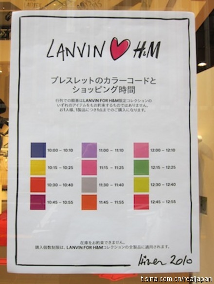 LANVIN for H&M排队 09:35 AM(日本时间)at 涩谷 排队人数215人。 工作人员正在帮助排在最末的顾客戴上绿色的手环。意思是,这位顾客的购物时间段是在12:15~12:25。手环的颜色不同,时间段不同。