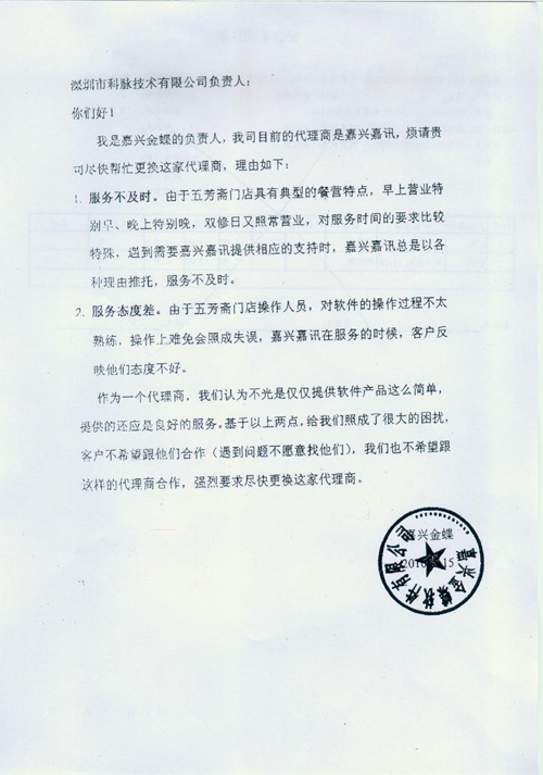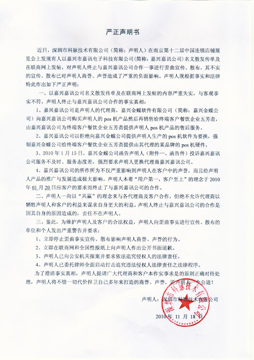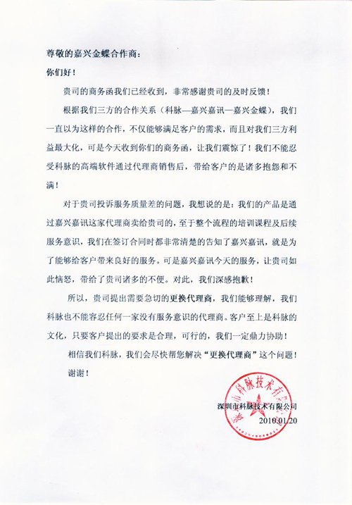科脉如此与人合作 关于嘉讯与“渠道”可卖(KEMAI)的故事 以下的故事情节也许不很精彩,但我们保证内容绝对真实有效。 深圳科脉(KEMAI)技术有限公司,我相信大家从认识就知道,他们是POS软件的开发商,在区外是做渠道的,但却最早在2009年底就违背双方合作的原则,人为制造我们嘉讯与嘉兴金蝶(负责五芳斋POS项目的总承包,也是我们嘉讯的客户)的矛盾,背地里直接接触我们嘉兴嘉讯的客户,为他们服务,收款,甚至于注册。证据有:客户证言,可卖(KEMAI)方经办人陈光中。 在本公司再三联系可卖(KEMAI)方主要负责人后,才算原则明确三方(深圳可卖(KEMAI)、嘉兴嘉讯、嘉兴金蝶)关系,是一个单线关系,并不是三角关系,并且明确了权利和义务。但深圳可卖(KEMAI)在此后的工作交接中百般推诿,比如在此前独自收客户货款,为客户注册的信息等工作,一直隐瞒着,这种阳奉阴违的合作,我们早就反感了,不入流!!此事具体经办人还是陈关中,而且就是此人,在此前双方合作中曾多次来嘉兴,我们是供他吃供他玩,待之如上宾,谁曾料想现在会用如此方式对待我们,农夫由衷感叹蛇之厉害。 双方合作就象是做兄弟,必须肝胆相照,彼此信任,为了一己之利而放弃合作原则的伙伴,无法再继续合作,以为现在捡得很多,但以后会失去更多!!就如同他们自己所称,所有的亲人、兄弟、朋友和合作伙伴都是“可卖”的!! 基于以上信息,由于科脉违反商业合作原则,我公司明确表态,不再把科脉作为核心合作伙伴。同时更希望广大相关硬件设备厂商及产品代理商,谨记此次我们嘉讯的“可卖”教训,切不可盲目选择软件开发商,必须擦亮眼睛。