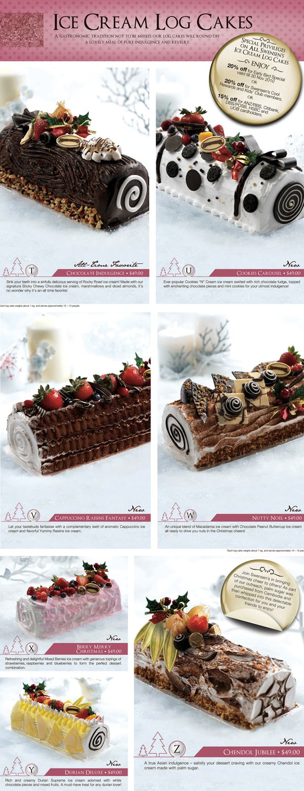 Swensen’s的冰淇淋蛋糕很是出名,今年共有7种品味供你选择:巧克力、曲奇、卡布奇诺、坚果、莓子、榴莲以及本地品味煎律(Chendol)。