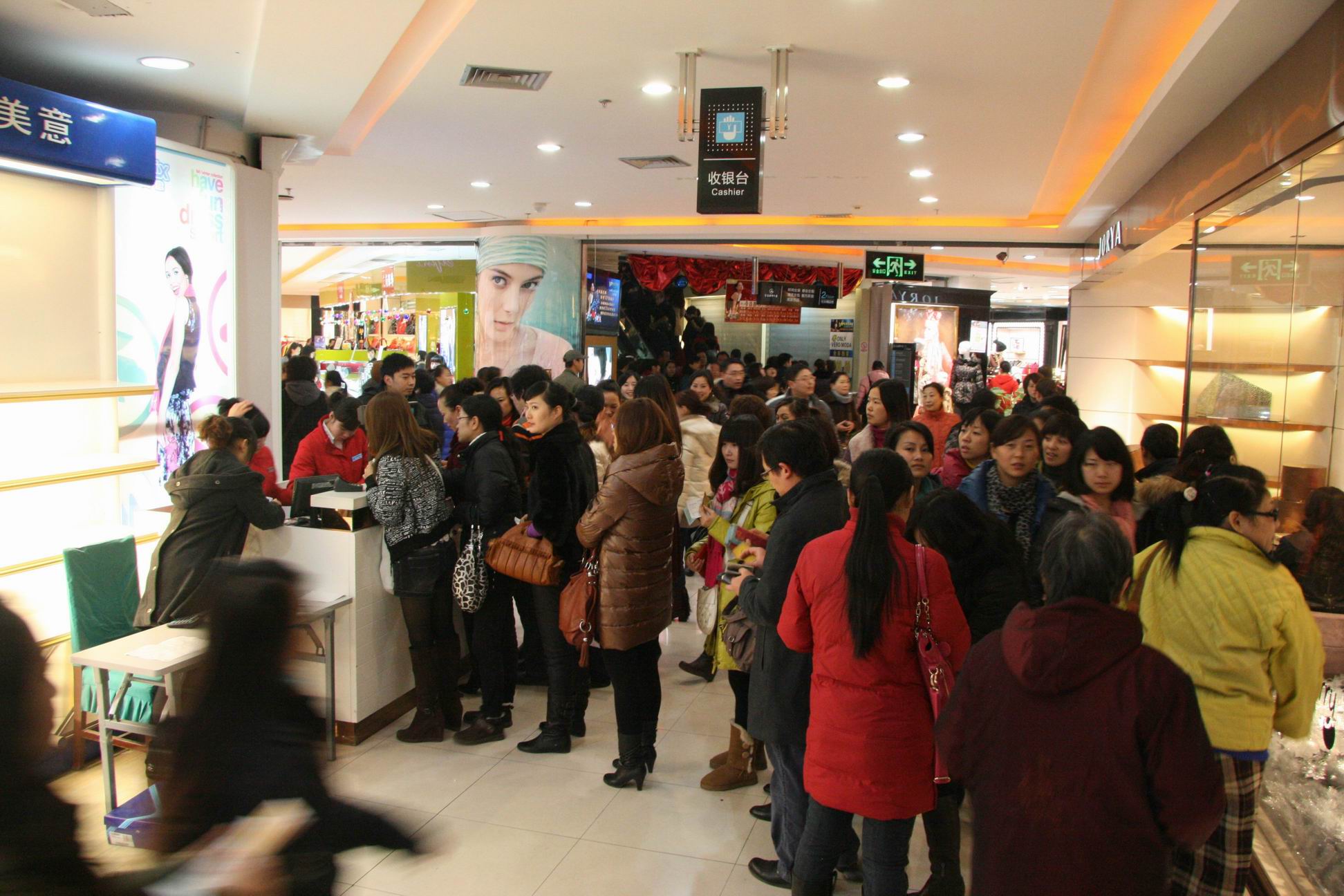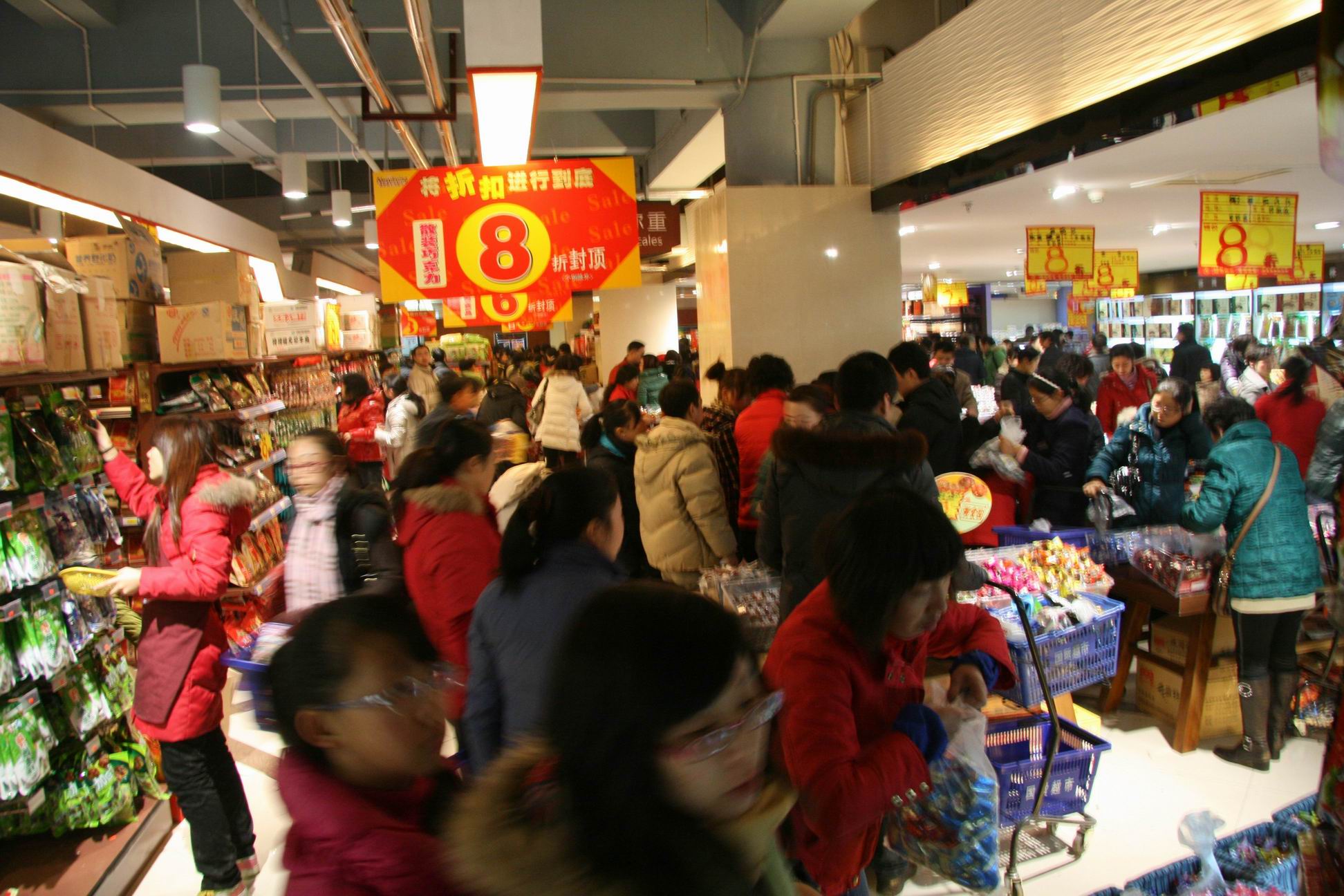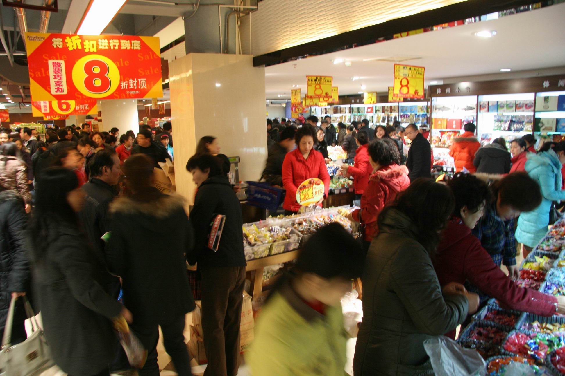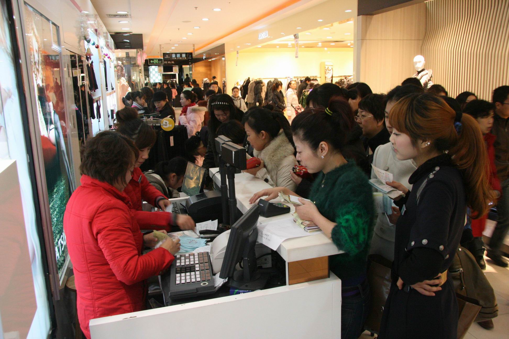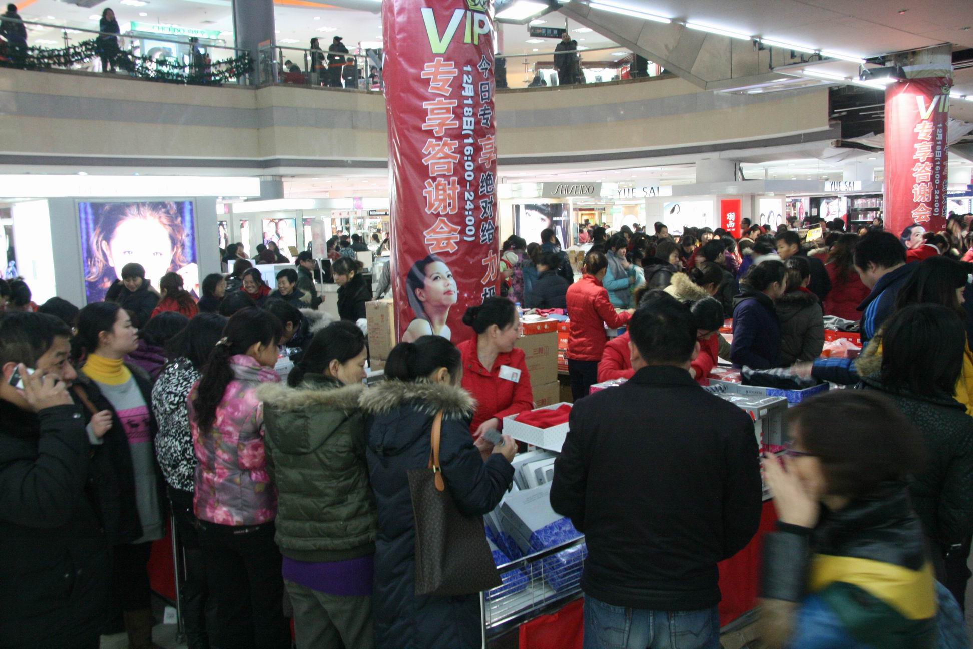17点,1200万元! 19点,2100万元! 21点,2580万元! 伴随时间的推移,国贸VIP答谢会销售额节节看涨! 3万元!5万元!7万元!11万元!顾客销售排行榜屡屡刷新! 18日,鄂西商界年度最盛大的酬宾活动——国贸大厦2010年VIP贵宾专场答谢会如期爆发,12万顾客激情光顾,8小时销售超3300万元,平均每秒1145元的进帐速度快过了点钞机,现场的火爆与“疯狂”令人惊叹。与去年VIP答谢相比,今天销售接近翻了一倍。 “真是太给力了!找任何熟人都不可能拿到这样的折扣,我已经把家里的现金都拿来了,还打算刷信用卡!”张小姐兴致勃勃地告诉记者。同伴的手里都提了七、八个购物袋,她的手上还有厚厚的一沓小票。 “即使摊上一家人的住宿费,我们还是省了不少钱!”来自荆州的李先生高兴地说,他的夫人、儿子大包小包地抱了一大堆,还分头在相邻的专厅里排队。 “真是太疯狂了,好象都不要钱一样,上来就‘抢’,高档百货店里这样的疯狂场面,我还是头一次看到!”在现场观摩的某品牌公司负责人感慨万端。 答谢会即将结束时,国贸大厦里依然是人声鼎沸,购物热情高涨,电梯上、专厅内、通道里到处都是人,收银台前依旧排着长长的队伍,4000多员营业员个个忙得筋疲力尽,火爆的场景与深夜的寒意形成了强烈反差。 答谢会现场,专程从北京、上海、南京等地赶来的品牌厂商代表纷纷表示,没想到这次答谢会如此火爆,没想到宜昌人的高端消费能力如此之强!有人感叹:原以为去年的1800万元就是极限,没想今年又翻了将近一番,宜昌经济太牛了!宜昌人真有钱!