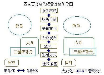 各百货店跨业经营。不再固守过去经营服装为主业的观念,大幅度压缩服装衣料、特别是男装的经营面积,银座三越业绩结构:男装占20%,女装占40%,超市及食品馆占30%,生活家居杂品占10%。普遍引进国际旅游等其它业种产品,比如银座三越特设中国独生子女专卖区,大丸及JR三越伊势丹与时尚购物中心整合、三越伊势丹开设MI PLAZA小型专门店,伊势丹新宿的女性妇科检查、高岛屋的综合家居馆、山田电器的超市和美食街、阪急的生活剧场、近铁的儿童动画拍摄项目等等。