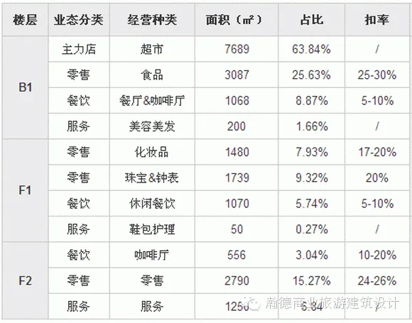 一线品牌平均租金:1-2 美元/平方米/天;二线品牌平均租金:2-3 美元/平方米/天;国际精品店以租金形式体现,均有保底销售,扣率1F:10-13%,2F:15-24%;百货类以扣率形式出现,无保底销售,扣率为:17-26%