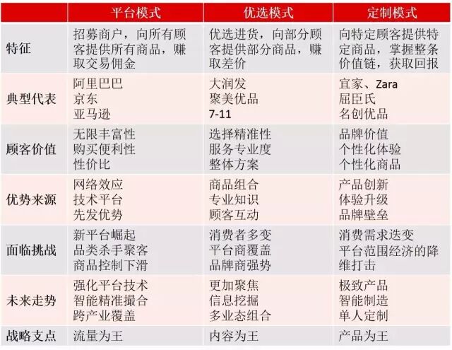 新零售意味着对人、货、场的重组,必将带来产业的重新组合,面对新零售挑战,零售商需要根据环境、客户群体和自身能力选择战略模式。根据盈利方式的不同,零售商可分为三种模式:收取交易佣金的平台模式、赚取差价的优选模式、消费者直接付酬的品牌自营模式。不同的战略模式创造不同的顾客价值,也有着不同的战略能力要求,在新零售大背景下,三种模式各有其发展走势。