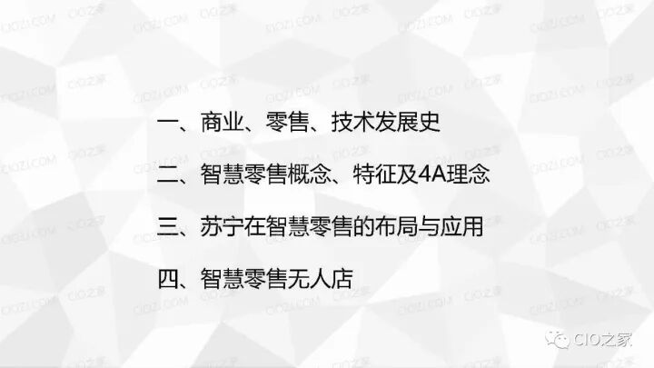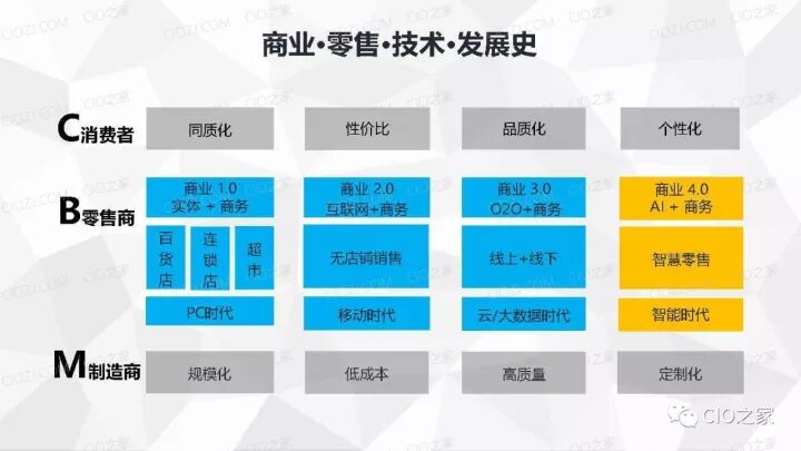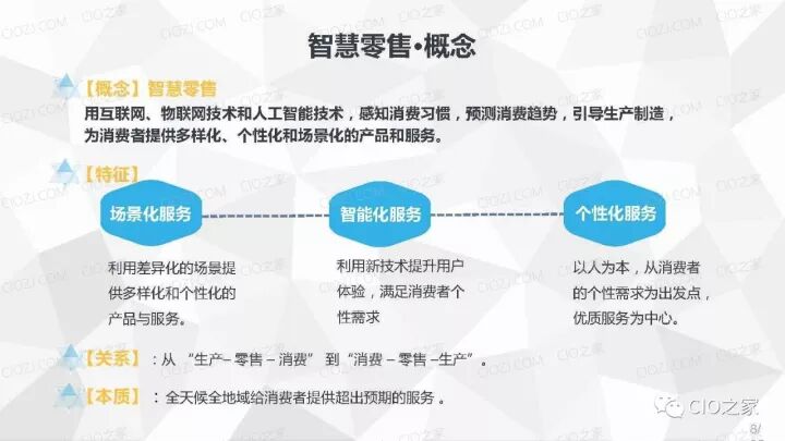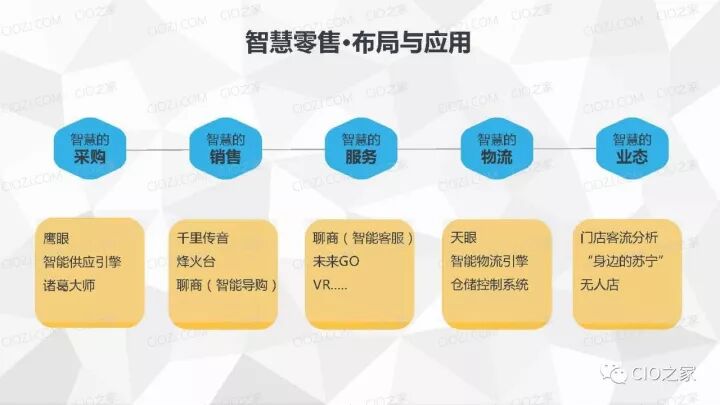 智慧零售就是运用互联网、物联网技术,感知消费习惯,预测消费趋势,引导生产制造,为消费者提供多样化、个性化的产品和服务。在这一阶段,互联网开始深入零售业的内核,最本质的资源,如物流、资金流和信息流。企业由此借助云计算、大数据等技术,构建核心竞争力。所以,除了前台渠道的互联网化,企业还要进行包括后台物流、资金流和信息流的互联网化,是全价值链的互联网化。事实上,看看近年来的“电商大战”就知道,企业间的竞争早已超越了单纯“价格战”,转而进入平台级对决阶段。企业真正比拼的是供应链、配送、营销、资金等每一个环节。“智慧零售”给众多企业的启发是:回归零售本质,并用互联网技术深入后台,改造价值链上的每一个环节,使整套零售系统更快响应,从而为消费者提供最需要的产品和服务。