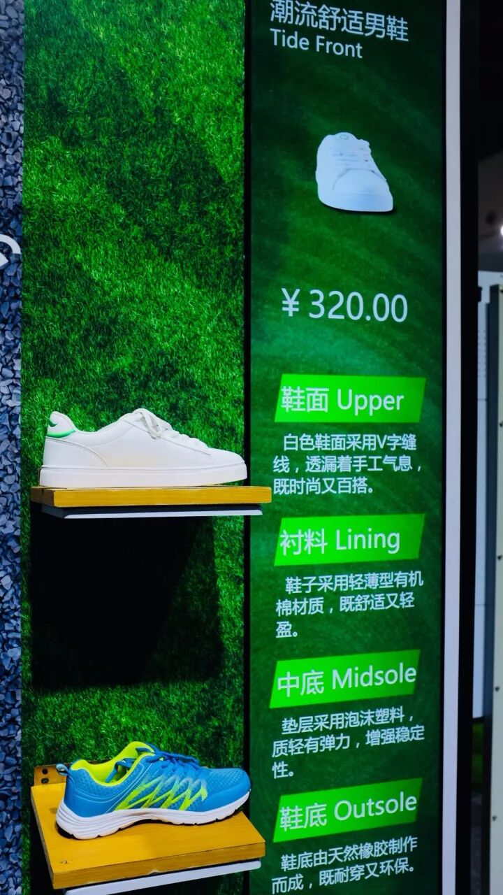 试衣间前方的电子橱窗方案使用了本次展会全新推出的产品——55寸双面显示屏。该产品的亮点在于正反两面可同时播放不同的内容素材,有利于营造独特的零售场景氛围。而且通过竖置吊装的方式所打造出的橱窗之感,真实还原了商场、专卖的展示场景 。