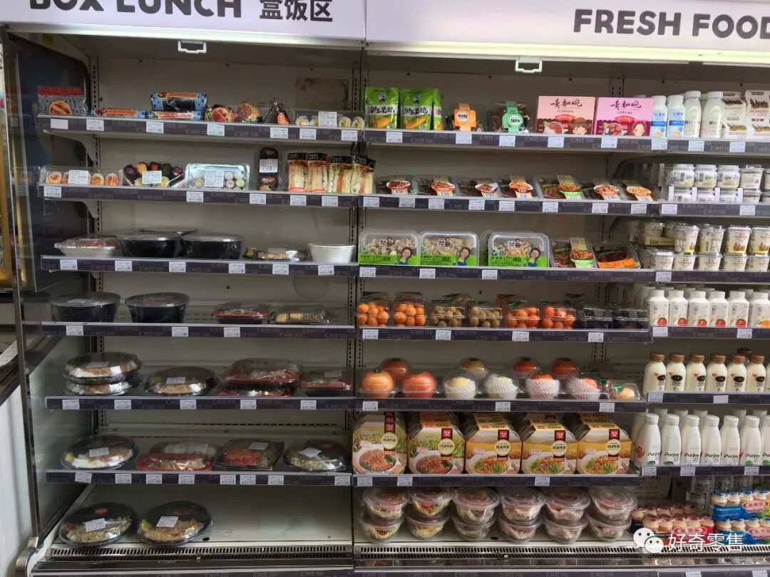 盒饭、水果区域。笔者去的时间是上午11点半左右,相对于2000人的客群,这么零星的十几个盒饭是不是有点太少了? 还有宣传单上的盒饭寿司85折的促销信息在此也没有找到。