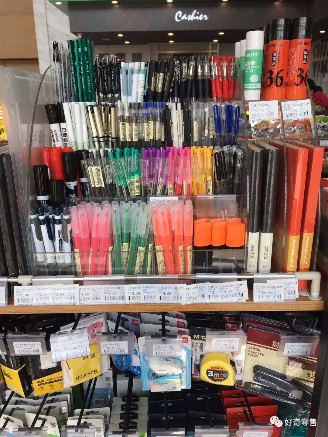 对于部分文具类商品,使用亚克力架子陈列,整齐、美观,顾客也容易选择购买。