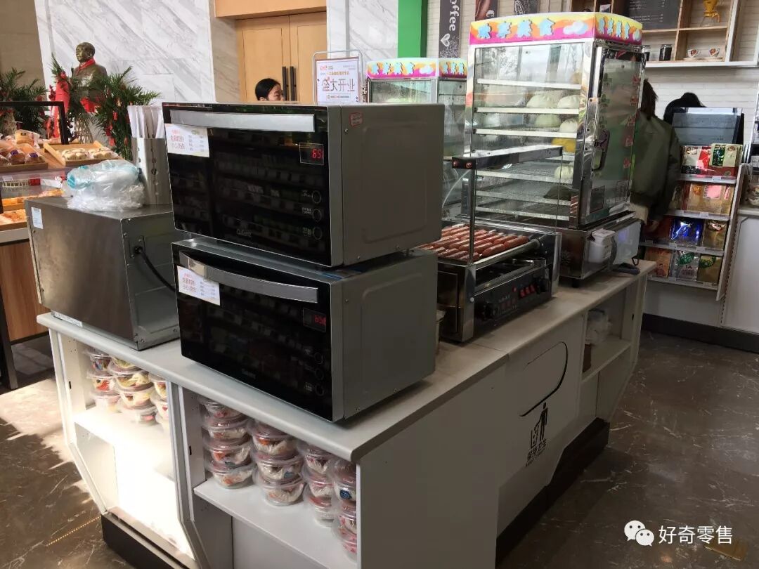 这就是前面提到的即食的自助区域。烤肠这一块如果能提供番茄酱和甜辣酱供顾客自行挤酱就更好了。微波炉上贴有各类商品加热的时间,点赞。