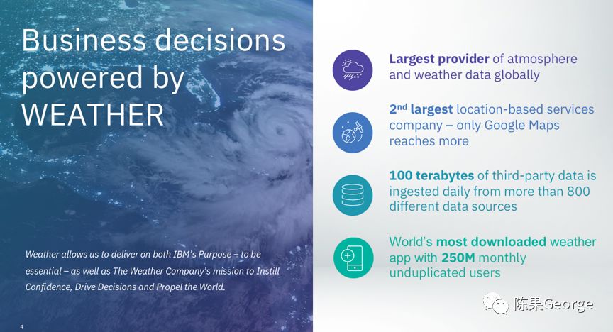 这里要特别提到,IBM在前年用数十亿美元收购的天气预报公司TWC,今天不仅是地理定位和天气数据的大数据平台,为零售提供决策支持,而且是人工智能的数字化营销广告平台。