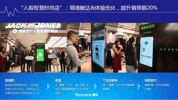 腾讯智慧零售与绫致时装集团共同打造了“人脸智慧时尚店”。通过社交数据精选高质潜客,并利用LBS位置服务、朋友圈本地广告和广点通系统精准投放,调动进店积极性;在店内,顾客通过“刷脸”注册会员,开启微信免密支付,并得到智能搜索引擎带来的商品偏好预测;在顾客离店后,通过社交平台、小程序和微信公众号,进行多场景二次营销,实现顾客召回。