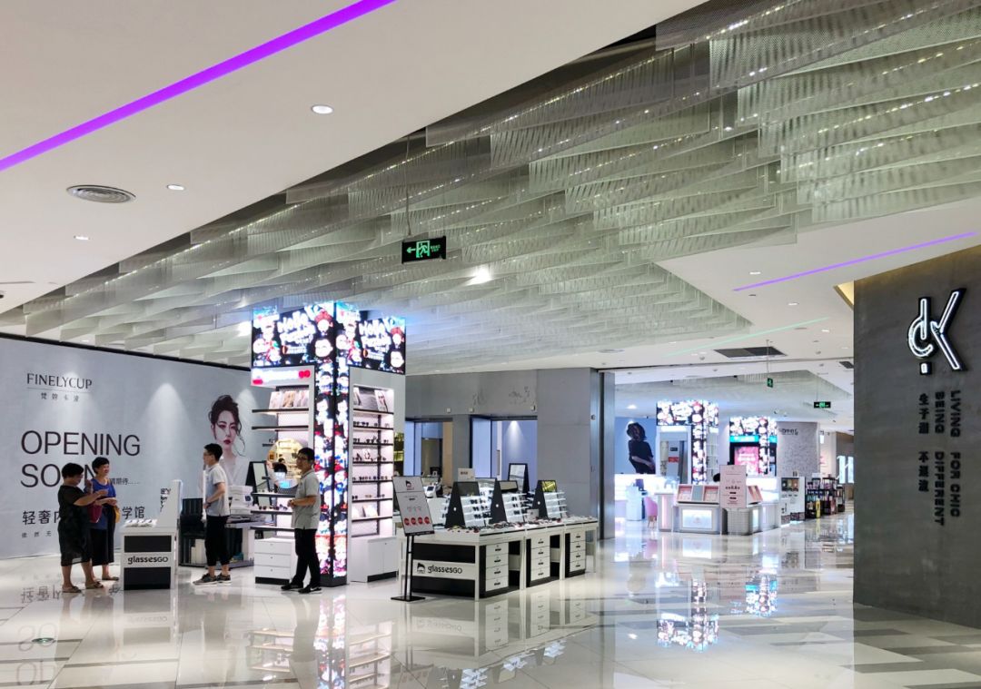 2F丽人广场,整体营造开阔的视觉效果,中庭周边以明亮的色调呼应,简单大气的线条与干净统一的灯光完美搭配,让整个女性主题楼层个性鲜明。而中庭的活动也都围绕女性商品展开,成为东百中心一个独特的主题空间。
