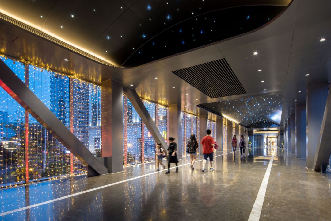 5F快闪中庭,深色金属板上的发光冲孔与利落的条纹元素契合时尚审美情趣,为不同品牌的快闪店留出很好的空间基础。