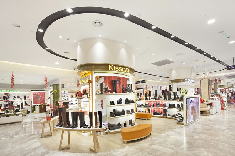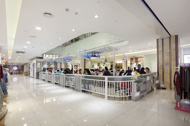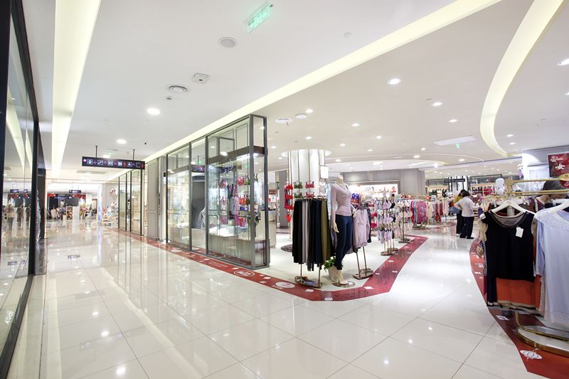 二层、三层则是针对女性消费的区域。分布着各个年龄段的女装、生活家居、轻餐和内衣区。顶部暗藏LED灯带,并使用石膏板刷白色乳胶漆,整体设计线条明朗、色调明快,贴近女性购物心理。