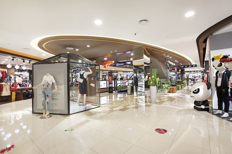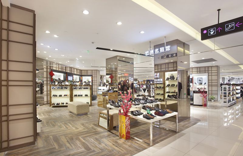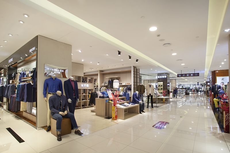 四层为男装、男鞋、男包等男性主题区,区别于女性商业区,部分区域采用浅咖啡色乳胶漆,更具商务风。五层则是运动休闲为主。
