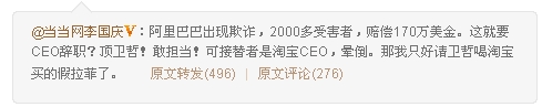 @当当网李国庆:阿里巴巴出现欺诈,2000多受害者,赔偿170万美金。这就要CEO辞职?顶卫哲!敢担当!可接替者是淘宝CEO,晕倒。那我只好请卫哲喝淘宝买的假拉菲了。