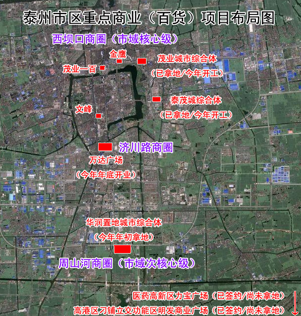 图片年初制作的,图上力宝广场和明发广场已经顺利拿地。华润置地项目——泰州“华润国际社区”确定入驻万象城购物中心。