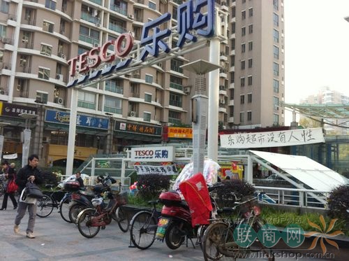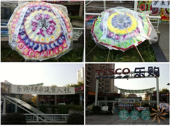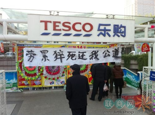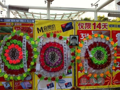 2011年12月11日,今天中午12点左右,联商网小编路过杭州乐购超市河滨店(建国北路471号),发现超市入口处,放置着5、6个大花圈,并挂有写着“劳累猝死还我公道”、“乐购超市没有人性”的白色横幅。引起了不少过往的行人,附近小区居民,前来乐购购物的消费者的围观议论,难道乐购超市河滨店出事情了?员工劳累猝死?