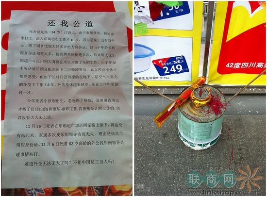 据悉,该事件电视媒体、报刊都相继有报道过。但是乐购方还是强行以“该员工用假身份证”为由拒绝给死者饶光强家属一个交待。才导致死者家属将死者相片、横幅、以及花圈放置在乐购超市入口处。