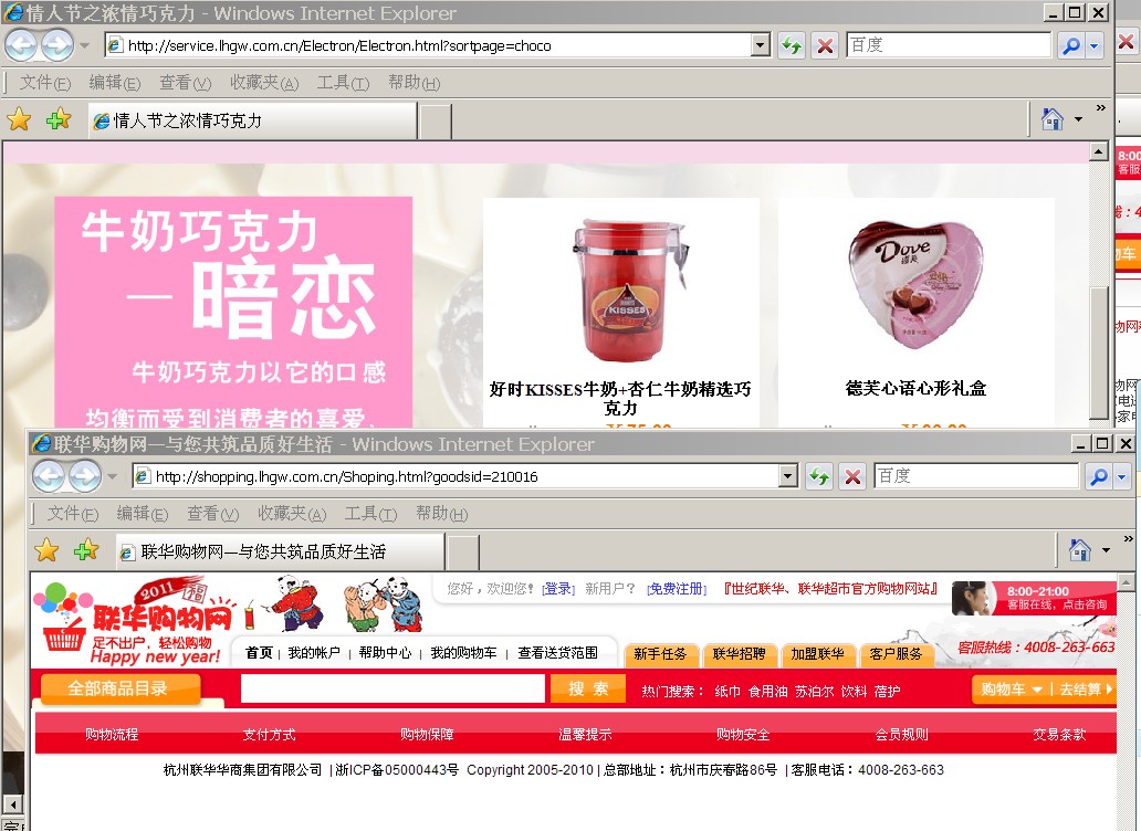 关于第2个问题,似乎是有解决办法的, 我从网站首页“浓情巧克力”广告点进去,弹出来的广告页面里有具体商品页的网址,但遗憾的是商品信息没有显示出来,如图