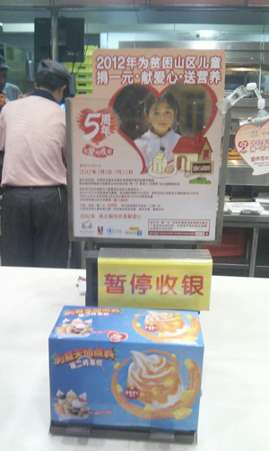 从宣传资料看, 只是说了KFC是个捐款点, 并没有说具体怎么捐。 所以如果服务员不提的话, 顾客绝少会想到是在收银台直接捐款或者主动问起。 从这样看, 服务员的“劝捐”还是有必要的, 但由此给顾客带来了道德压力。 窃以为在收银台旁设一捐款箱更合适, 并可自助拿感谢卡。