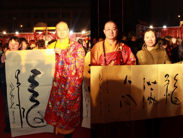 当晚23:40,焦作市佛教协会会长、千年古刹圆融寺现任住持果建法师和三维董事长许冰来到撞钟活动现场,果建法师现场挥毫送福。