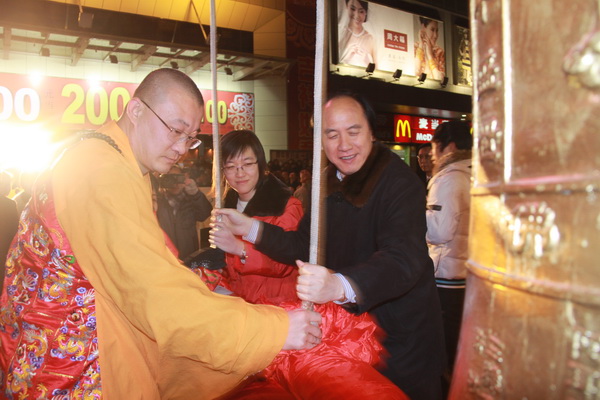 24:00,果建法师和三维公司董事长许冰共同敲响了寓意吉祥的新年钟声,全场一片欢呼!