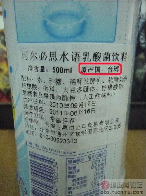 记者按照网贴的指引,在北京万达广场附近的一家超市中买到了这种饮料。该饮料的包装上有一半日文,另一半是繁体中文。饮料的产品信息中介绍称,“可尔必思水语”是一种原产于日本的乳酸菌饮品。而瓶身上还有一张不干胶贴纸,上面用简体字书写了产品配料、生产日期和经销商等信息,其中“原产国:台湾”的字样非常醒目。