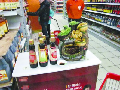昨日,在站前一家超市的调料区,促销桌上的酱油盆景引来不少市民。不少市民听了促销员的讲解后,都买上一两瓶。促销员刘女士说,这是按照厂家的要求昨天摆出来的,目的是直观地向顾客展示酱油的色泽和味道,盆景旁边的七八瓶酱油都是可以让顾客品尝的。