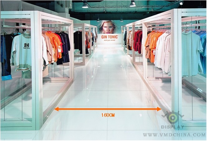 上图的服装店铺里,道具之间有两块地砖的距离,大概在160CM左右,这样的通道,哪怕有一个人等留在任何一边挑选商品,也足于保证两个人相向而行。