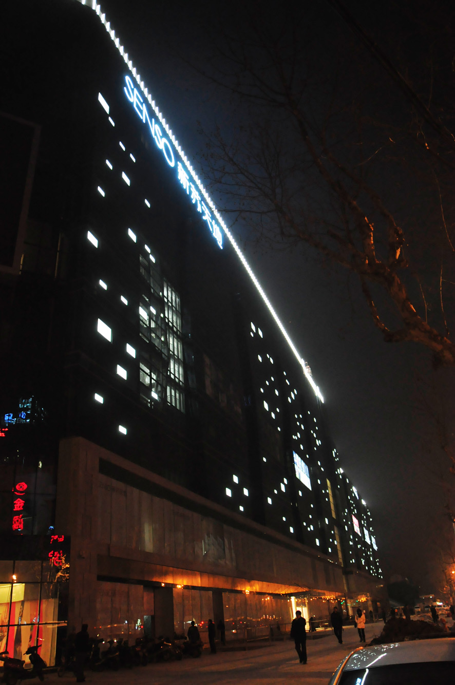 在十字路口对面拍的,1楼和2楼的橱窗还没亮,想象一下,亮会很炫哦。