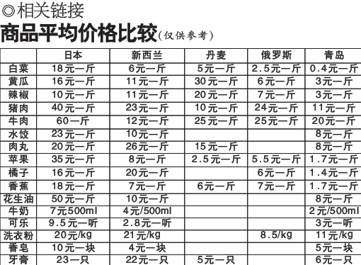 丹麦人均月收入2万元(折合人民币,下同),猪肉10元钱一斤,在超市摔坏东西不用赔偿,买贵了可以退 ;俄罗斯大蒜很便宜,洗衣粉用碧浪……