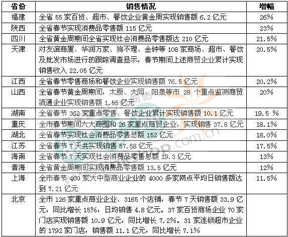 据商务部监测,大年三十至正月初六,零售商场和餐饮企业实现销售额4045亿元,同比增长19%。以下是联商网编辑整理的2011年全国部分省市兔年春节销售情况以及增幅比较。