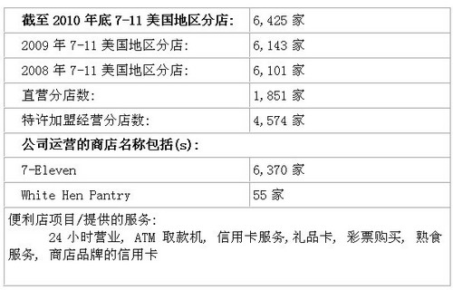 美国7-11分部计划到2012年,将现有门店都转化为特许加盟的经营模式同时将联营的门店名字也转换成7-11的标牌。